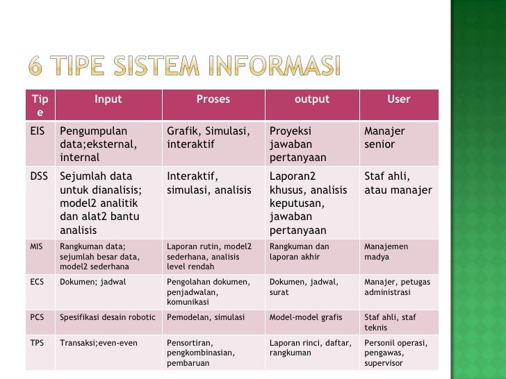 These systems provide information to manage for planning and decision making. The information provided by these systems is based on both the internal and external data using various data analysis tools. N Teknologi komputer sekarang ini merupakan bagian terpenting dalam dunia bisnis dan jelas dalam pelbagai bidang lainnya.